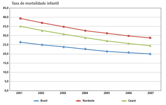 A Taxa de Mortalidade Infantil no Ceará diminuiu 30,28% em sete anos. No país, a queda entre os anos de 2001 a 2007 foi bem menor: 23,95%. A redução continuada das mortes entre menores de um ano no Estado é confirmada pelo Instituto de Pesquisa econômica Aplicada (IPEA), que divulgou nesta quarta-feira, 1º de fevereiro, o capítulo cearense do estudo Situação Social nos Estados. De acordo com o estudo, o índice de crianças que morrem antes de completar um ano de vida no Estado caiu de 35 no ano de 2001 para 24,4 em 2007. Para o IPEA, “o Ceará apresenta-se em vantagem, comparativamente ao quadro apresentado na região Nordeste, onde as taxas foram de 39,3 e 28,7, em 2001 e 2007, respectivamente”.