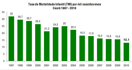 O estudo do IPEA, que mesmo trabalhando com estimativas, confirma a linha de redução da Taxa de Mortalidade Infantil medida pela Secretaria da Saúde do Estado. Em 15 anos, de 1996 a 2010, a TMI do Ceará diminuiu em 64,97%, passando de 37,4 para 13,1. A Sesa utiliza dados reais de registro de nascimento e óbitos O número total de mortes infantis caiu de 4.380 em 1996 para 1.685 em 2010. As doenças diarreicas, responsáveis por 17,3% dos óbitos infantis em 1996 e 21,3% em 1999, causaram 1,8% das mortes em 2010. Com esses resultados, as doenças diarreicas diminuíram a participação na composição da TMI de 5,4 por mil nascidos vivos em 1996 para 0,2 em 2010, a maior redução entre as causas de mortes infantis. A redução da TMI entre as causas perinatais, maiores responsáveis pelos óbitos infantis, foi de 16,8 para 8,2 entre 1996 e 2010.