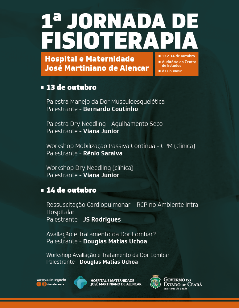 O Hospital e Maternidade José Martiniano de Alencar (HMJMA), da Secretaria de Saúde do Ceará (Sesa), do Governo do Estado, realiza, nos dias 13 e 14 de outubro, a 1ª Jornada de Fisioterapia da instituição. “Este é um momento ímpar para a troca de experiências e renovação de conhecimento”, destacou o fisioterapeuta e coordenador do serviço de Fisioterapia da unidade, Marcos Antônio Celestino.