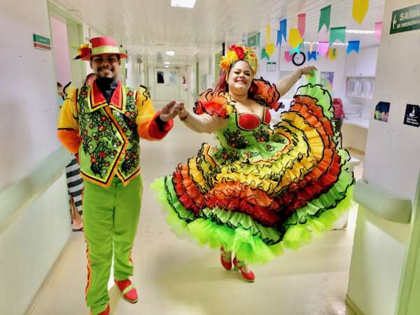 O casal de uma quadrilha junina foi convidado para puxar a animação dos colaboradores, acompanhantes e pacientes