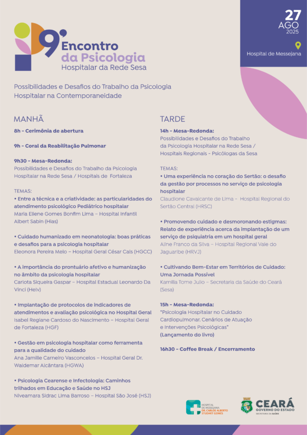 O Hospital de Messejana Dr. Carlos Alberto Studart Gomes (HM), unidade da Secretaria da Saúde do Ceará (Sesa), sediará, no dia 27 de agosto, o 9º Encontro da Psicologia Hospitalar da Rede Sesa, com o tema “Possibilidades e desafios do trabalho da Psicologia Hospitalar na contemporaneidade”. Promovido pelo Serviço de Psicologia do HM, o evento é gratuito e as inscrições estarão disponíveis no dia 1° de agosto.