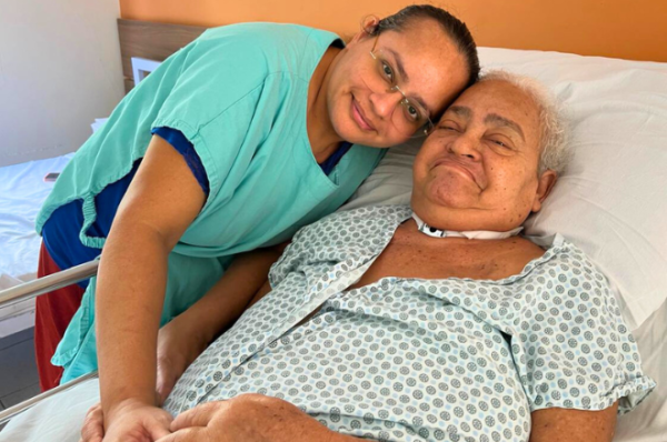 Leidiane Rodrigues, 38, cuida da mãe Salete Silva, 60, vítima de um acidente de moto que ocasionou em traumatismo craniano. A idosa está em processo de reabilitação e, segundo a filha, a fé é a principal aliada no tratamento. “Minha mãe é evangélica e gosta de cantar e assistir aos cultos pela TV. O prato favorito dela é galinha e ela comeu aqui, além disso, a psicóloga promove conversas de acordo com as preferências dela”.
