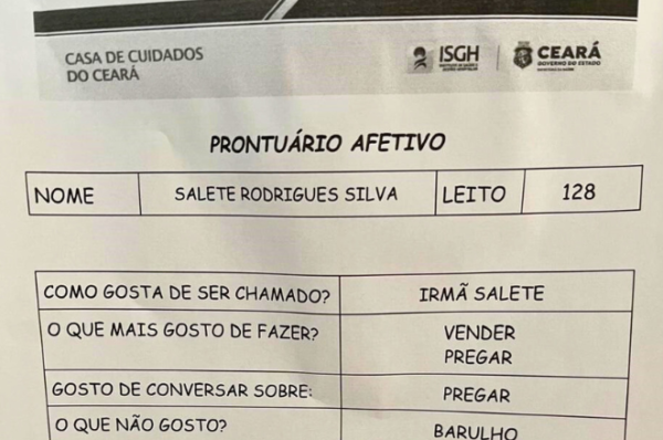 Conhecer gostos e informações pessoais podem individualizar alguém, mostrando características únicas e aproximando pessoas. Diante disso, a Casa de Cuidados do Ceará (CCC), implantou o prontuário afetivo. Nos leitos dos pacientes constam apelidos carinhosos, preferências musicais, comidas preferidas, entre outros dados que podem não ser relevantes clinicamente, mas tornam o atendimento mais humanizado, um dos valores da Secretaria da Saúde do Ceará (Sesa).