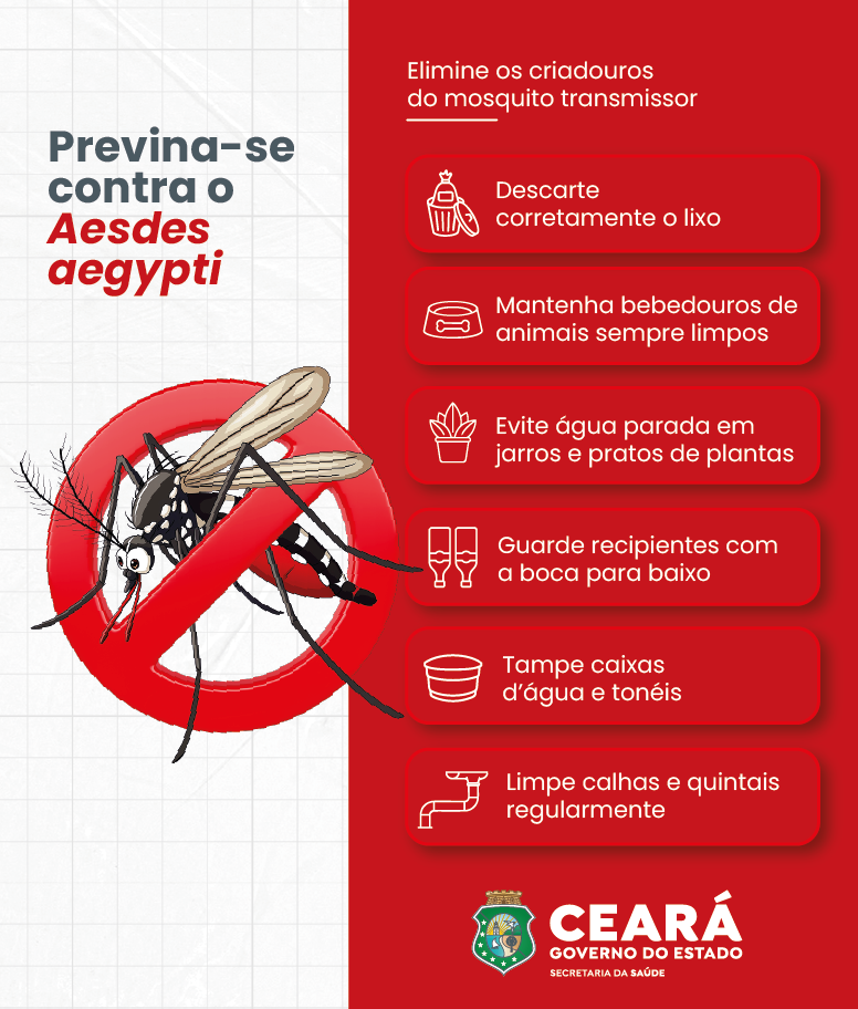 A principal forma de prevenção contra o Aedes aegypti continua sendo a eliminação de locais que possam acumular água e servir de criadouro para o mosquito. A população tem papel essencial nesse processo, adotando medidas simples no dia a dia, como: