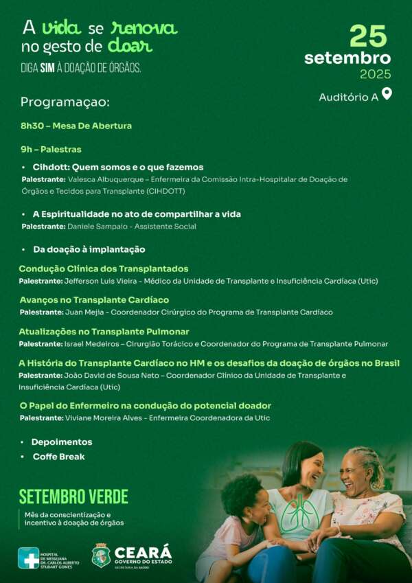 O Hospital de Messejana Dr. Carlos Alberto Studart Gomes (HM), da rede da Secretaria da Saúde do Ceará (Sesa), realiza, na próxima quinta-feira (25), um evento alusivo ao Setembro Verde, mês dedicado à conscientização sobre a importância da doação de órgãos e tecidos. A ação é organizada pela Comissão Intra-Hospitalar de Doação de Órgãos e Tecidos para Transplante (Cihdott) do HM, que este ano celebra 20 anos de implantação. O evento acontece na mesma semana em que se celebra o Dia Nacional de Doação de Órgãos e Tecidos, em 27 de setembro, data que simboliza a solidariedade e a esperança de milhares de pessoas que aguardam por um transplante em todo o país.