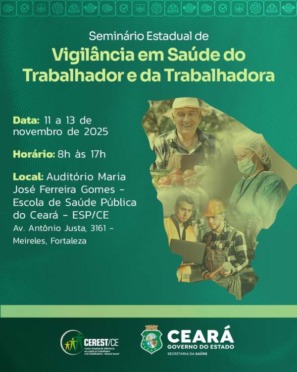 Estão abertas as inscrições para o Seminário Estadual de Vigilância em Saúde do Trabalhador e da Trabalhadora, que será realizado de 11 a 13 de novembro de 2025, na Escola de Saúde Pública do Ceará (ESP/CE), autarquia vinculada à Secretaria de Saúde do Estado do Ceará (Sesa). As inscrições podem ser feitas até 31 de outubro de 2025. Já os trabalhos para a Mostra podem ser submetidos até 23h59 do dia 30 de outubro de 2025, com divulgação dos selecionados em 1º de novembro de 2025.