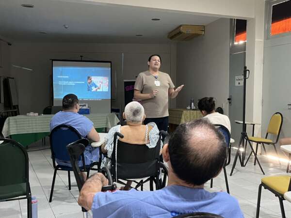 Pacientes, cuidadores e integrantes da equipe multidiscplinar acompanham palestras sobre AVC na Casa de Cuidados