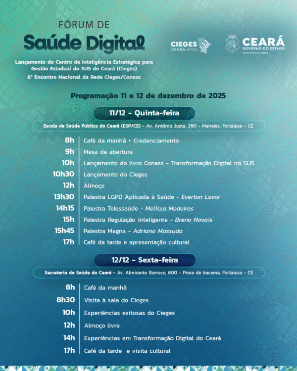 A Secretaria da Saúde do Ceará (Sesa) realiza, nos dias 11 e 12 de dezembro, o Fórum de Saúde Digital, evento que marca o lançamento do Centro de Inteligência Estratégica para Gestão Estadual do SUS do Ceará (Cieges-CE) e integra o VI Encontro Nacional da Rede Cieges/Conass.