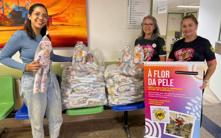 Uma boneca que vai além de um simples brinquedo e se transforma em companhia, memória e cuidado. É o que propõe o projeto À Flor da Pele, iniciativa de voluntários brasileiros que busca levar alegria e acolhimento a crianças que passaram por internações hospitalares em todo o país. No Hospital Geral Dr. Waldemar Alcântara (HGWA), unidade da rede da Secretaria da Saúde do Ceará (Sesa), a entrega das “companheiras de pano” marcou o momento da alta hospitalar de pequenos pacientes.
