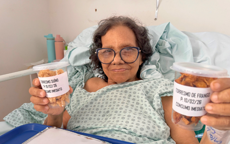 Para atender ao pedido, a equipe de nutrição preparou dois tipos de torresmo: um de porco e outro de frango. A nutricionista Stefane Barros explica que a solicitação chegou por meio da equipe médica. “Quando soube do desejo, busquei uma forma de adaptar o preparo para oferecer da melhor maneira possível. É importante atender esses pedidos, pois são pacientes que, muitas vezes, estão em situações delicadas”, destaca.