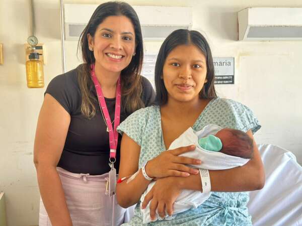Sara com o filho Noah, ao lado da enfermeira Larisse Alves, que integrou a equipe responsável pela ação e pelo atendimento